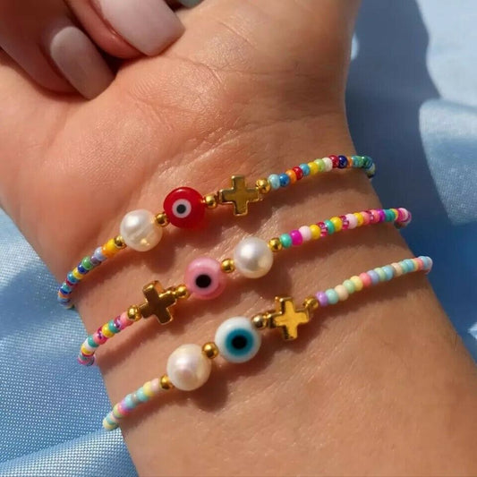 Evil Eye Greek Mati Cross Charm Pearl Colourful Seed Beaded Bracelet