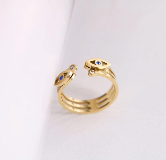 Evil Eye Greek Mati 18K Gold Stainless Steel Three Layered Zircon Ring