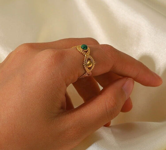 Evil Eye Greek Mati 18K Gold Stainless Steel Green Stone Adjustable Ring